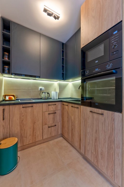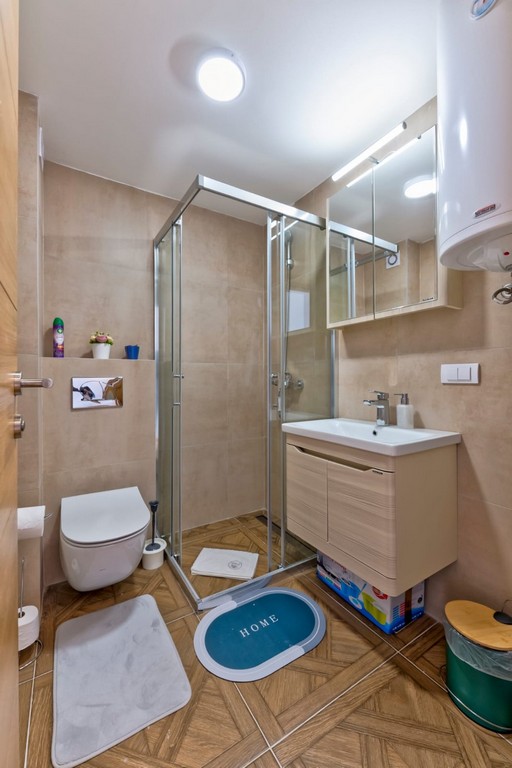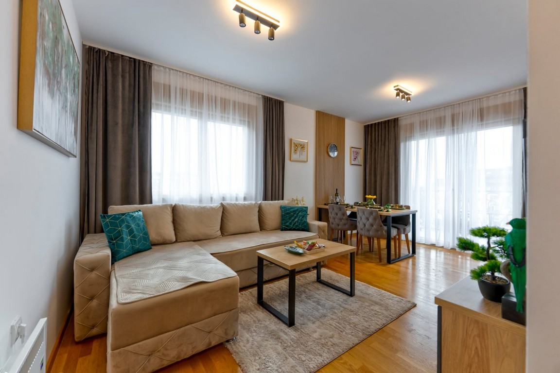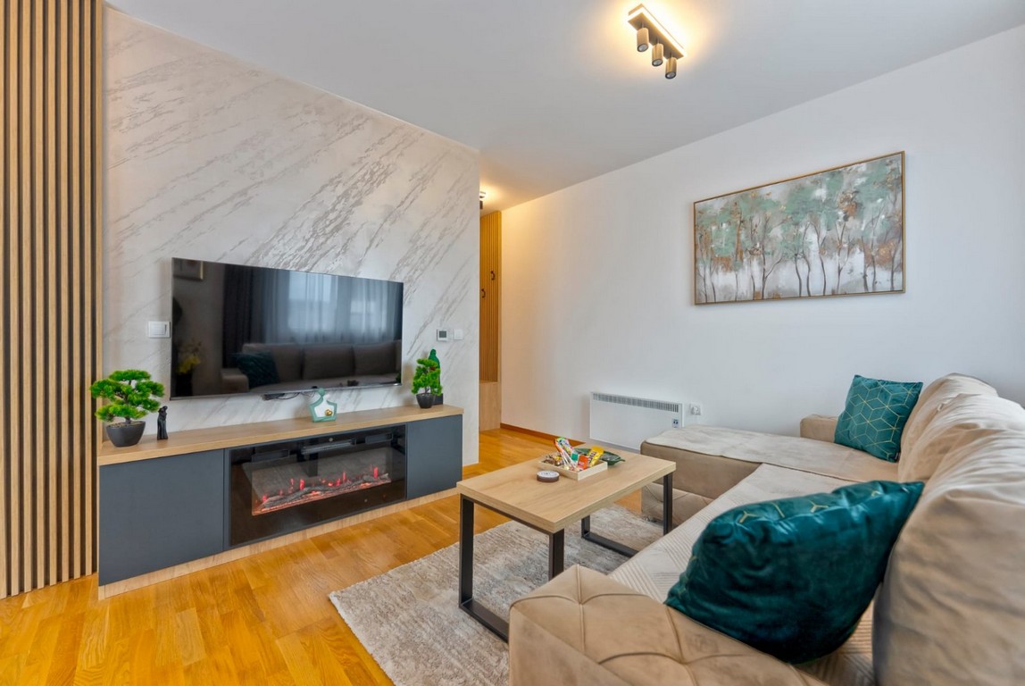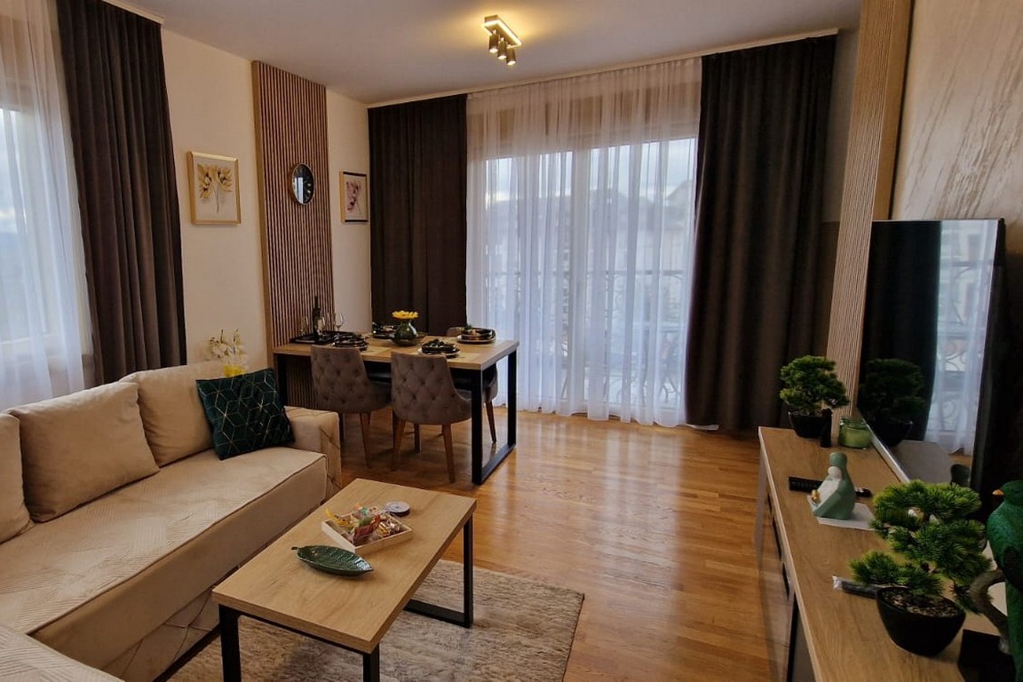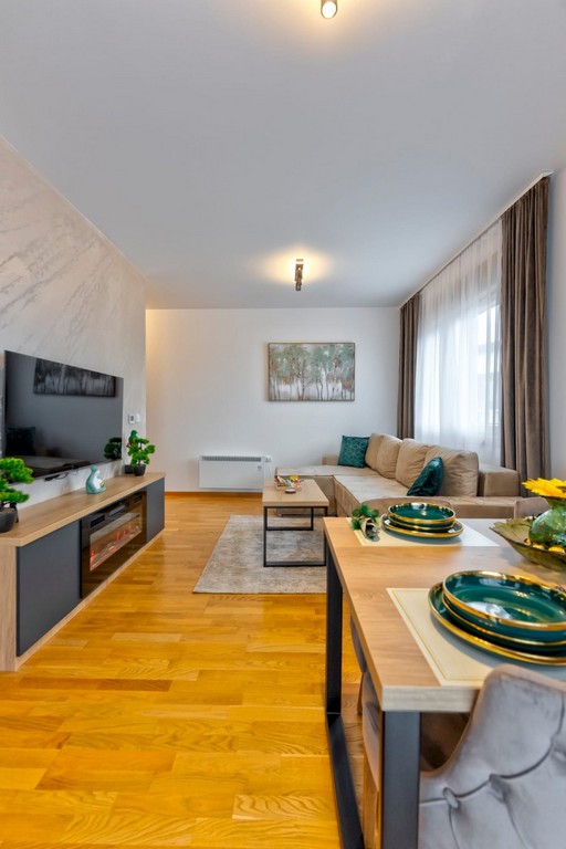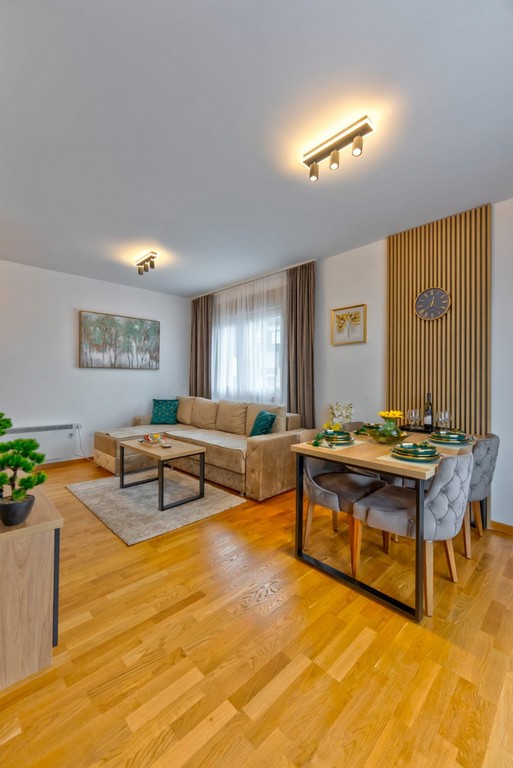 Sastoji se od dnevne sobe, spavaće sobe, kompletno opremljene kuhinje, trpezarije, kupatila i terase.